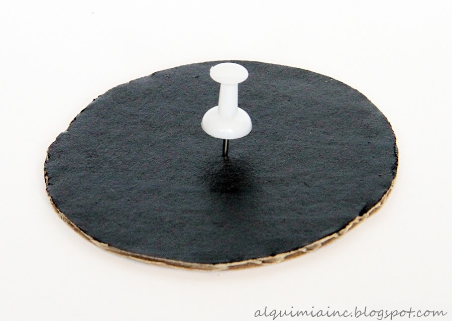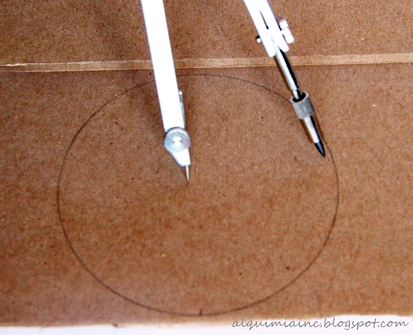 Una vez tengamos la medida exacta, cogemos el trozo de cartón, pinchamos y marcamos una redonda con el compás. (si no tenéis compás, podéis poner el bote encima del cartón y marcar la redonda. Recordad que a la hora de cortar tendréis que recortar por dentro del lápiz para que quede un poquito más pequeña.)