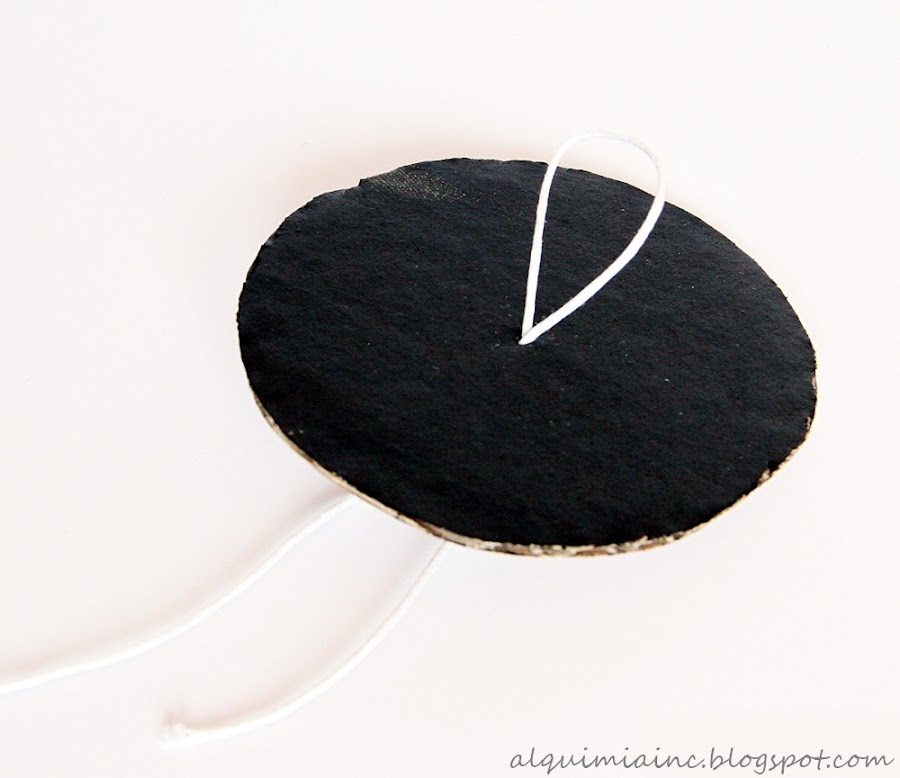 Pasamos los dos extremos del hilo por dentro del agujero y hacemos un nudo en la parte trasera.