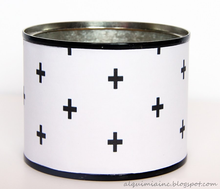 Mientras se seca la tapa, cogemos el papel que hemos cortado antes, le añadimos cola en cada uno de los extremos y envolvemos la lata, y este sería el resultado:
