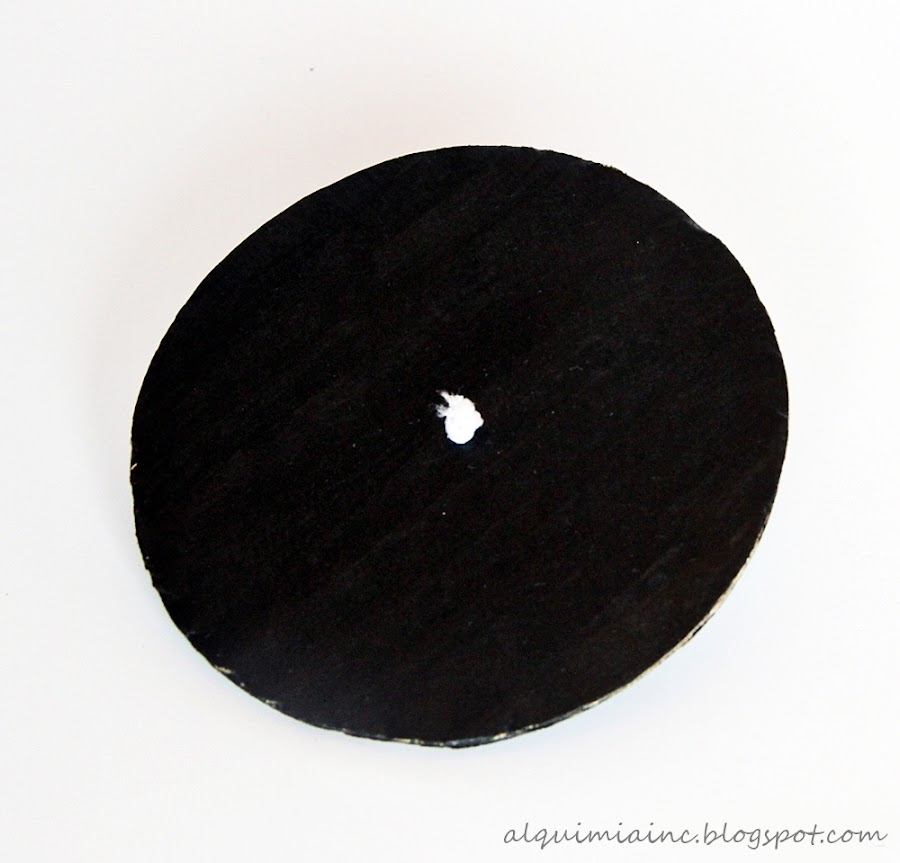 Ahora cogemos la tapa que anteriormente hemos pintado y con la ayuda de una aguja, chincheta etc.. hacemos un agujero en medio de la tapa.