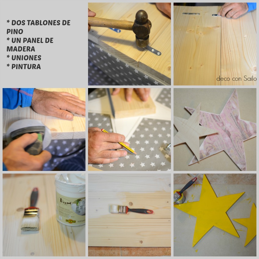 Pintar al gusto. En este caso utilicé una pintura al agua, porque quería que se viera la veta de la madera en el cabecero. Para las estrellas una acrílica normal.