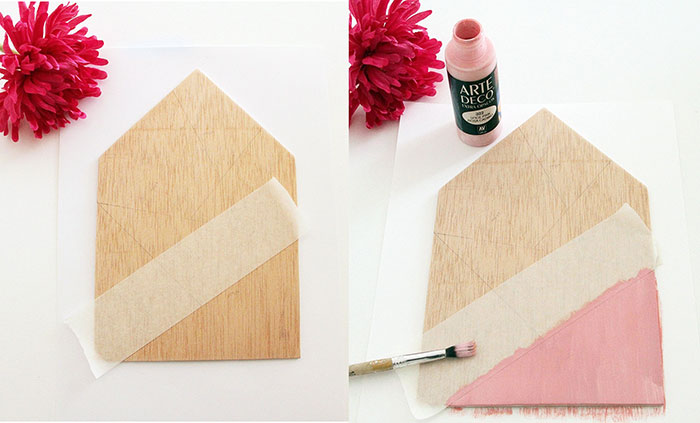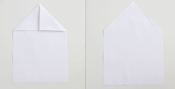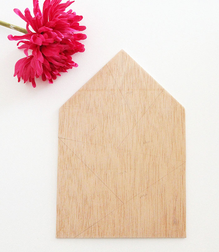 Después recortamos lo doblado para que nos quede de punta, en forma de casita, y copiamos la plantilla encima de la lamina de contrachapado. Con el cutter y la ayuda de la regla, cortamos para que coja la forma.