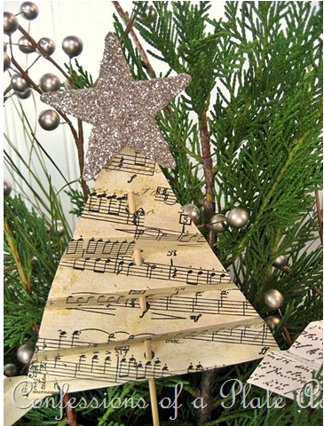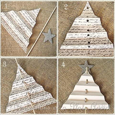 La idea que os muestro hoy, viene de la mano de un blog muy interesante. Si quieres hacerte uno igual, vas a necesitar hojas de libros viejos o partituras de música, unas brochetas de madera y un poco de foam de purpurina para hacer la estrella.
