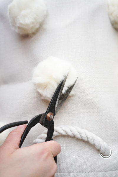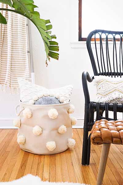 Un DIY genial, divertido y válido para todas las estancias de la casa. Desde el salón para guardar mantas hasta el cuarto de los peques. Se trata de una cesta de tela básica, a la que se le cosen unos pompones y el efecto es increíble.