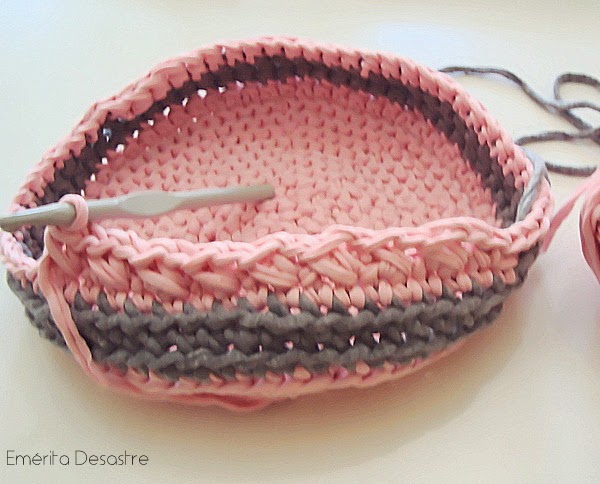 Para terminar se hace una vuelta en gris y se hacen las asas.El alto lo decidís vosotras; yo he hecho dos rayas grises y dos rosas y he terminado con otras dos grises para las asas.