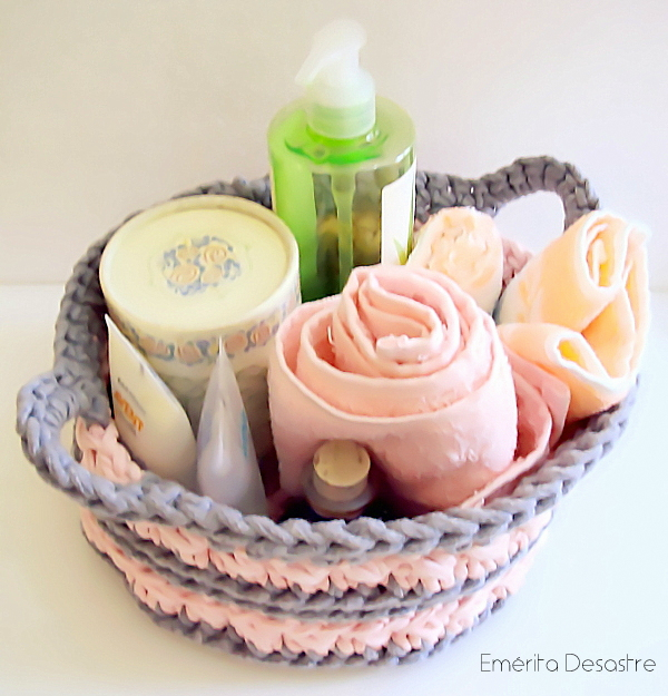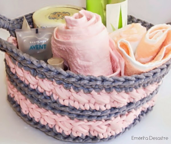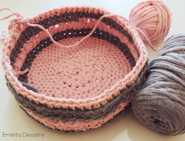 En mi último artículo os mostré el cesto de trapillo que había hecho para unas compañeras de trabajo. Os puse el de Sofía y ahora os pongo el de Irene; al tener dos ovillos rosa y uno gris y sobrarme bastante trapillo, se me ocurrió hacerlo de rayas y así aprovecharlo todo.