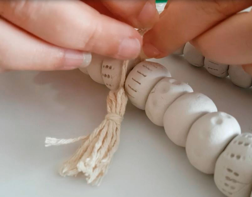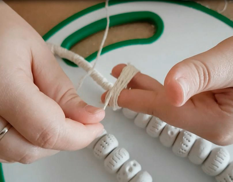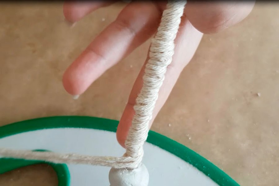 Una vez pasadas todas las bolas por el cordel, poco a poco iremos envolviéndolo con otro trozo de cordel. La idea es transformar ese hilo fino en algo bastante más grueso. Así que varias pasadas de cordón os irán genial.