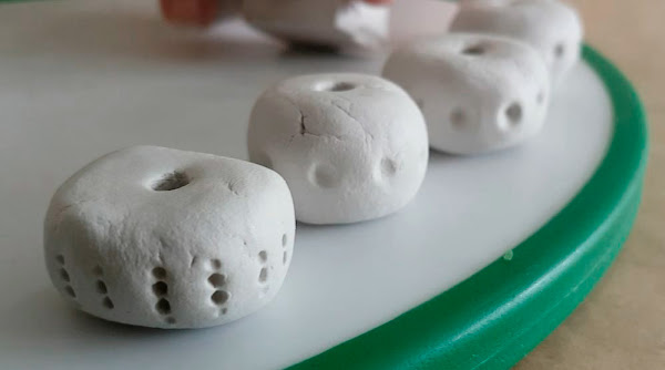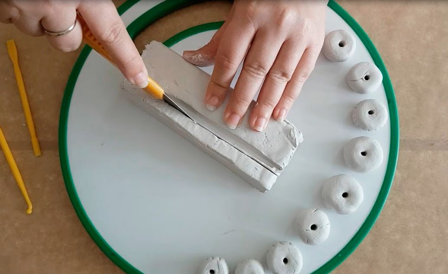 Cuando tengamos la bola hecha, con la ayuda de un punzón, haremos un agujero en el medio, y después, con la ayuda de los otros punzones de formas o cualquier cosa que os sirva para marcar la arcilla, iremos dibujandole una cenefa por todo alrededor.