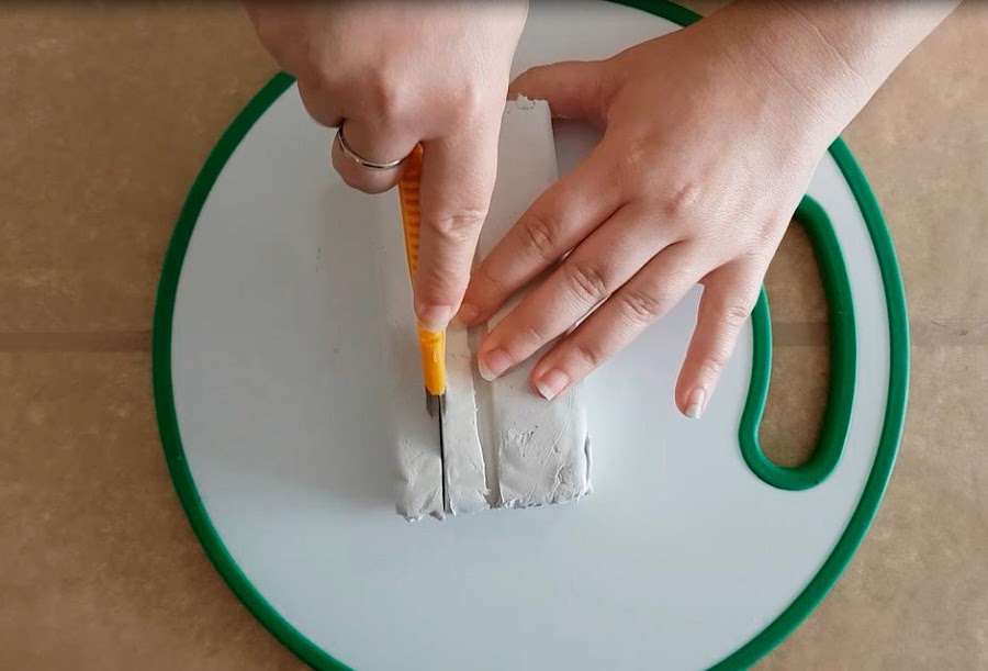 Antes que nada tenemos que abrir la arcilla polimérica y cortarla en tiras. Yo he preferido ir cortando una a una para asegurarme que no la malgastaba. Así la que me sobraba la volvia a colocar dentro del paquete y listo. Una vez hayamos cortado una tira, la dividiremos en pequeños trozos mas o menos iguales y empezaremos a hacer bolas.