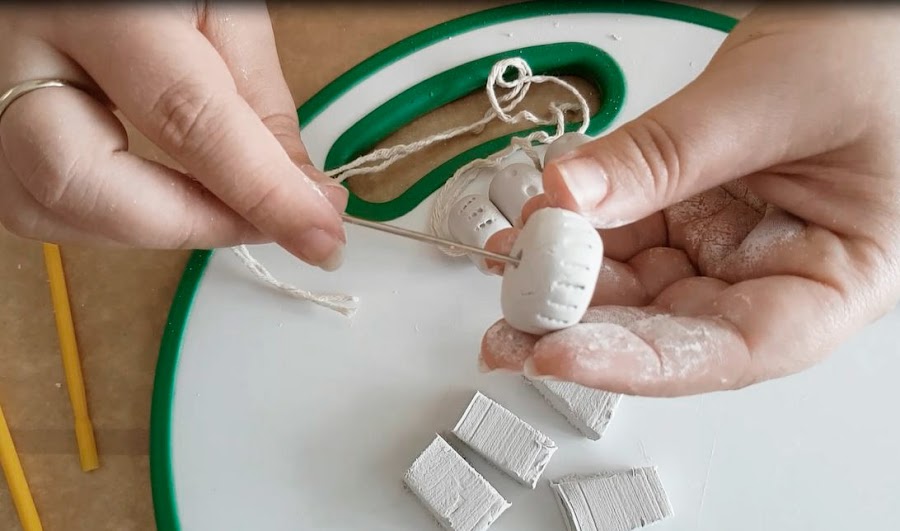 Una vez tengamos todas las bolas listas, con la ayuda del cordel y la aguja, las iremos enfilando una a una. Se pueden dejar que se sequen antes, pero yo he preferido hacerlo, y dejarlo listo, así se irá secando por su cuenta poco a poco.