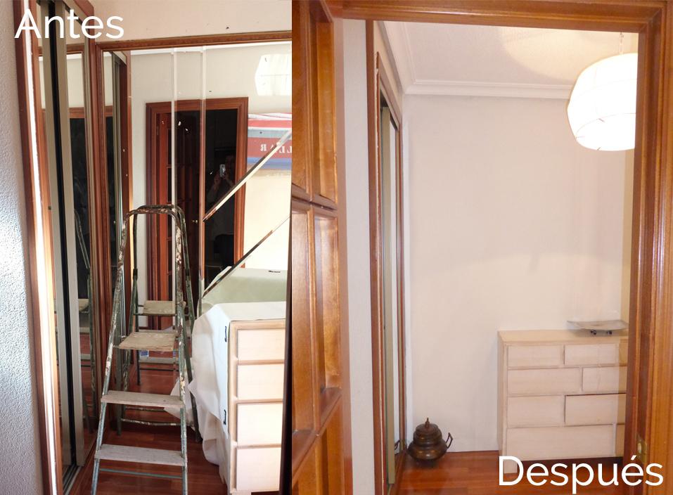 Así que aquí el vinilo no nos valía, por un lado no quería tocar ese marco de flores, no fuera a ser que se estropease esa “maravilla” de marco floreado, y por otro lado no me disimularía esos biseles en diagonal (¿Pero a qué mente calenturienta se le ocurre poner espejos con bisel en diagonal?). Lo mismo me ocurría con el papel pintado, a ver si las flores se iban a destrozar una vez que me tenga que ir de esta casa y por lo “únicas” que son el dueño las quiere conservar…
