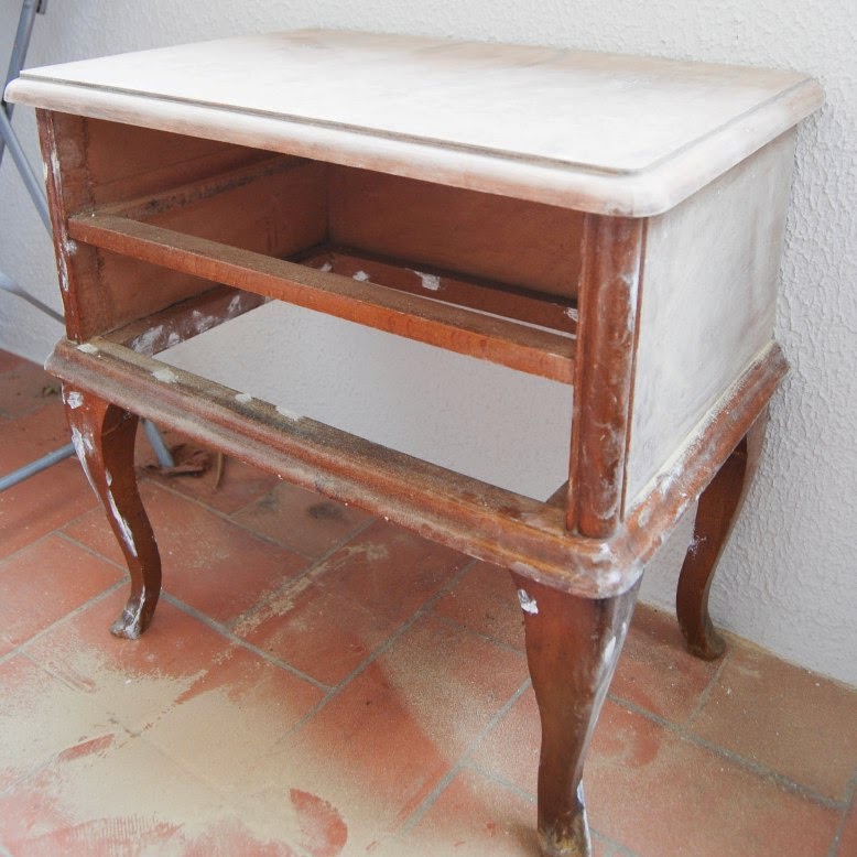 Paso 2. Tapar agujeros y lijar. Después del tratamiento anticarcoma, procedemos a tapar los agujeros con masilla, en este caso blanca, ya que las dos mesitas irán pintadas. Si tienes pensado dejarlas en color madera, recuerda usar una masilla lo más parecido al tono de la madera de tu mueble, cuando está humedecida. La mesita de los tres cajones tenía el barniz en perfecto estado, así que el lijado lo hicimos suave, pero la mesita pequeña necesitó de un lijado fuerte e intenso para igualar las partes donde el barniz había saltado. No la decapamos porque al ir pintada no era necesario, aunque si no te gusta rascar, el decapado es la mejor opción.
