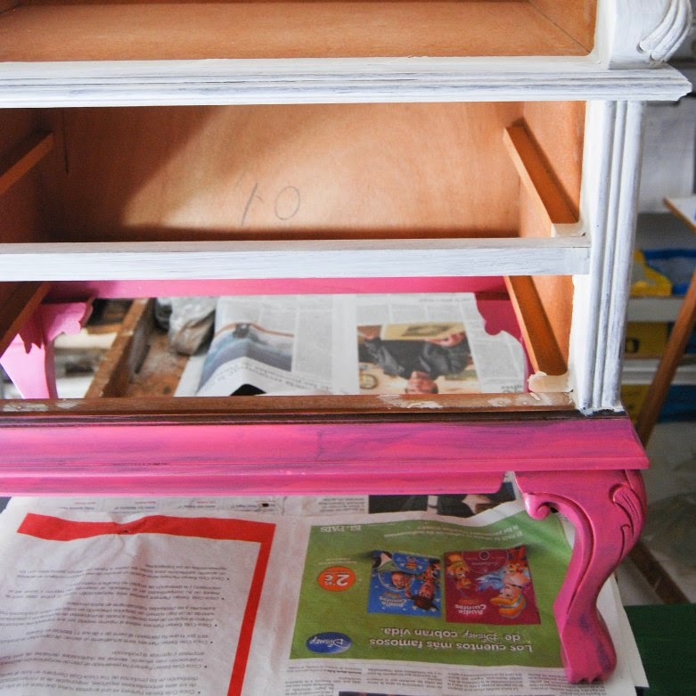 Paso 4. Aplicar el color. En el caso de la mesita grande, dejamos el blanco para el final, ya que es más delicado, y empezamos por el rosa de las patas. No tapamos con cinta de carrocero, ya que esta arrancaría la imprimación. Optamos por tapar con cinta cuando estemos pintando de blanco. La mesita pequeña no presenta esa dificultad, ya que la pintamos toda de verde esmeralda, menos el interior, en color lima.
