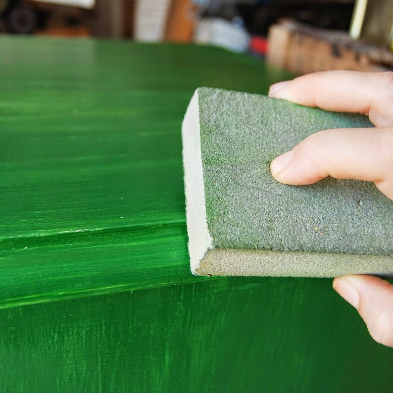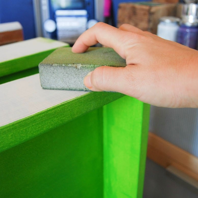 Paso 5. Lijar y dar la segunda capa. Aprovecha el lijado de la primera capa para eliminar gotones o rugosidades que puedas haber dejado, y que sea suave, que no llegues a ver la madera. Es muy importante lijar cuando la pintura ya esté seca, comprueba los tiempos de secado que marque el fabricante. Aplica una segunda capa, incluso una tercera si no ha quedado perfectamente. Una vez seco, retirar la cinta de carrocero con mucho cuidado de no arrancar la pintura y a disfrutar de tus nuevos muebles.