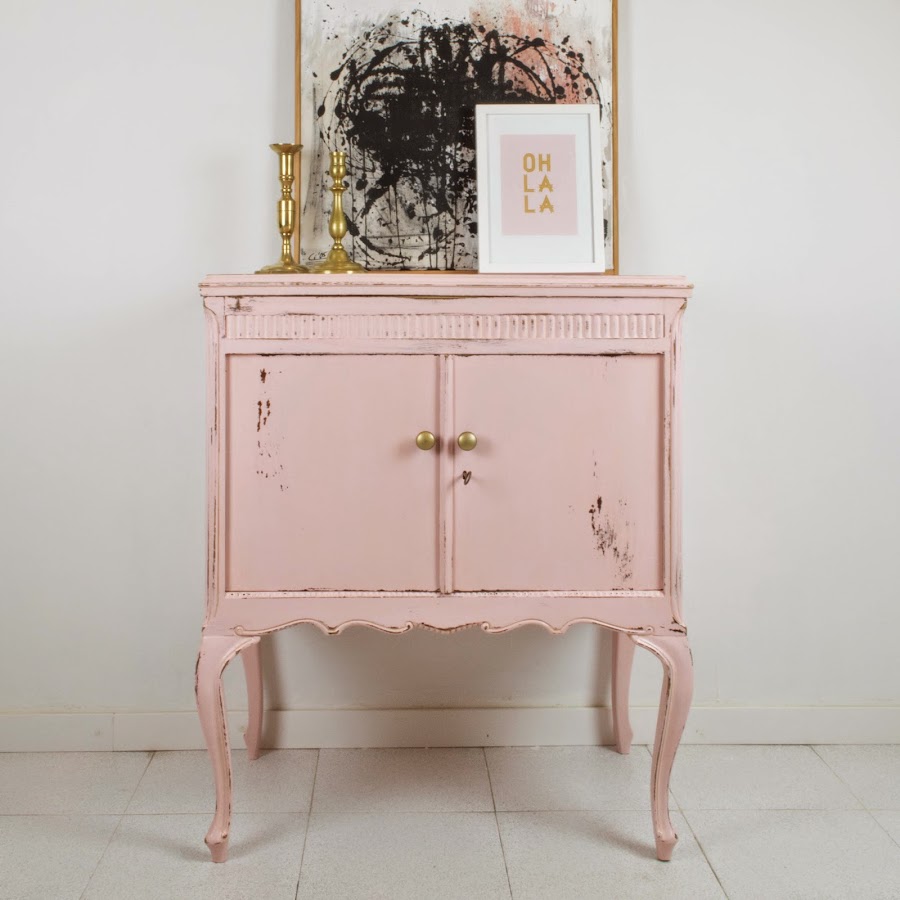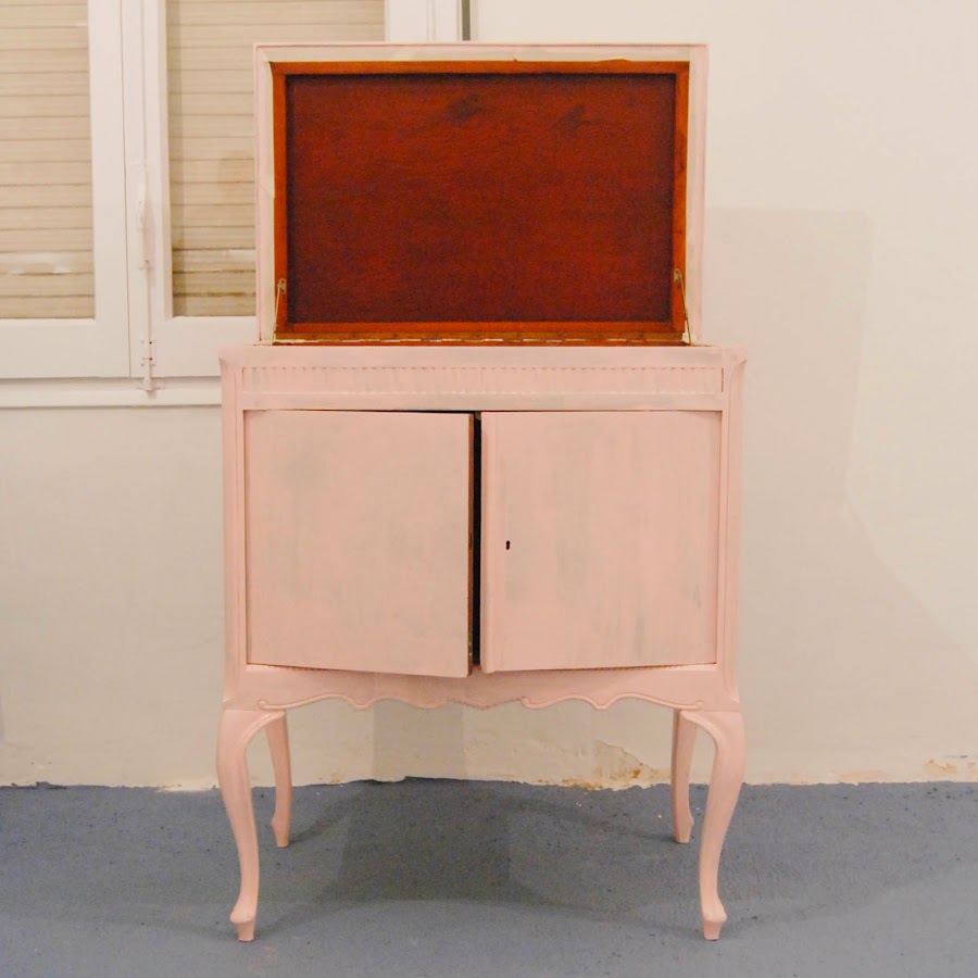 Inspirados por sus dos pasiones, decidimos pintarlo en color rosa enpolvado, mantener la madera en el interior donde fuera posible y el resto de color marrón chocolate. En primer lugar tapamos todos los agujeros que había sufrido, debido a los cambios de uso, después hicimos un estante para la parte de arriba, recuperando su forma original de mueble tocadiscos.