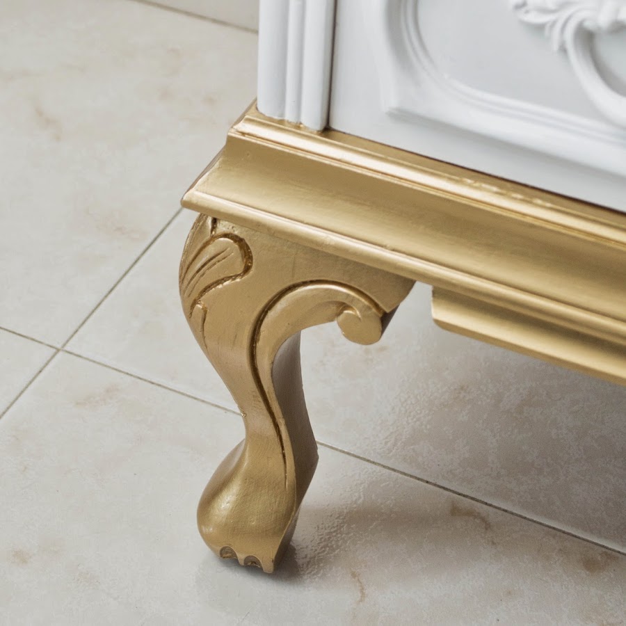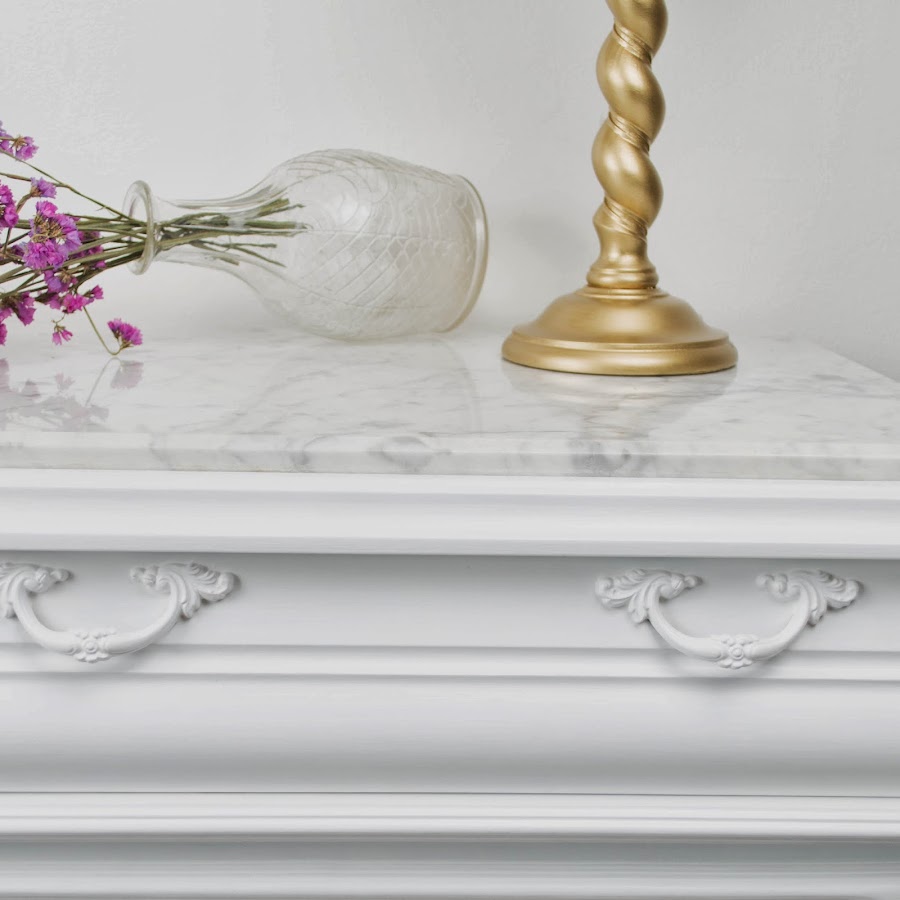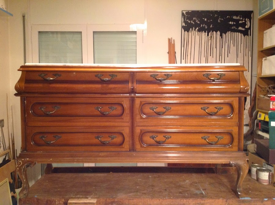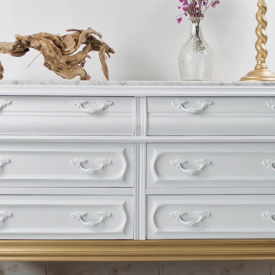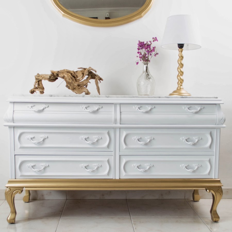 La cómoda Valverde apareció en nuestras vidas como tantas otras cosas: por casualidad. Alguien que se mudaba de piso la tenía y no le cabía en su nueva vivienda... Y las redes sociales hicieron su magia. Cuando la vimos, su peso y contundencia no dejaban lugar a duda: era un buen mueble, con mucho potencial, pero que nosotros no pondríamos en nuestra casa así, tal cual. El transporte hasta casa fue complicado, debido a su peso y al respeto que le teníamos al sobre de mármol... Y una vez en el taller, analizamos la situación: se trataba de una cómoda de los años 60-70, realizada en varias maderas diferentes, donde el mármol y sus patas decoradas marcaban el acabado que funcionaría mejor. Para resaltar las vetas del mármol, lo mejor era usar el blanco como color de fondo, y para resaltar sus patas decoradas y darle un toque de elegancia al conjunto, el dorado jugaría un buen papel.
