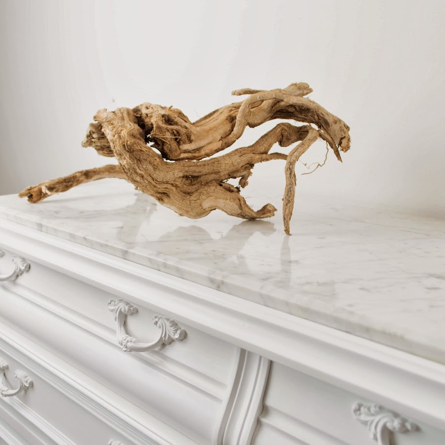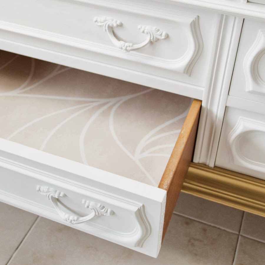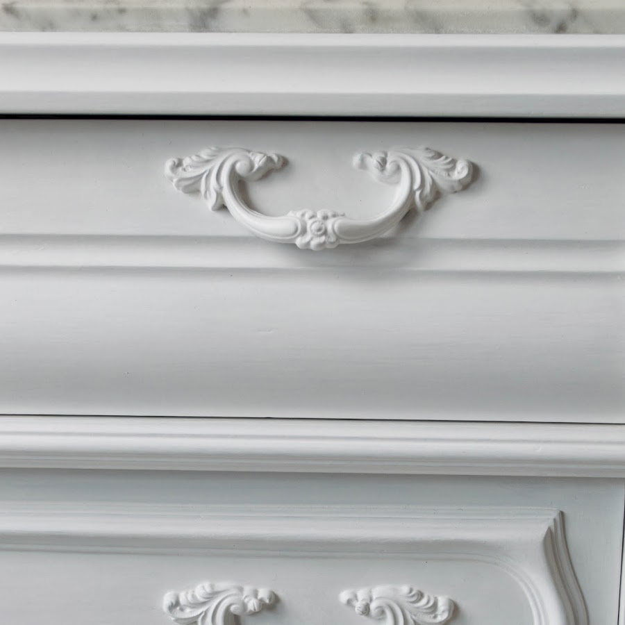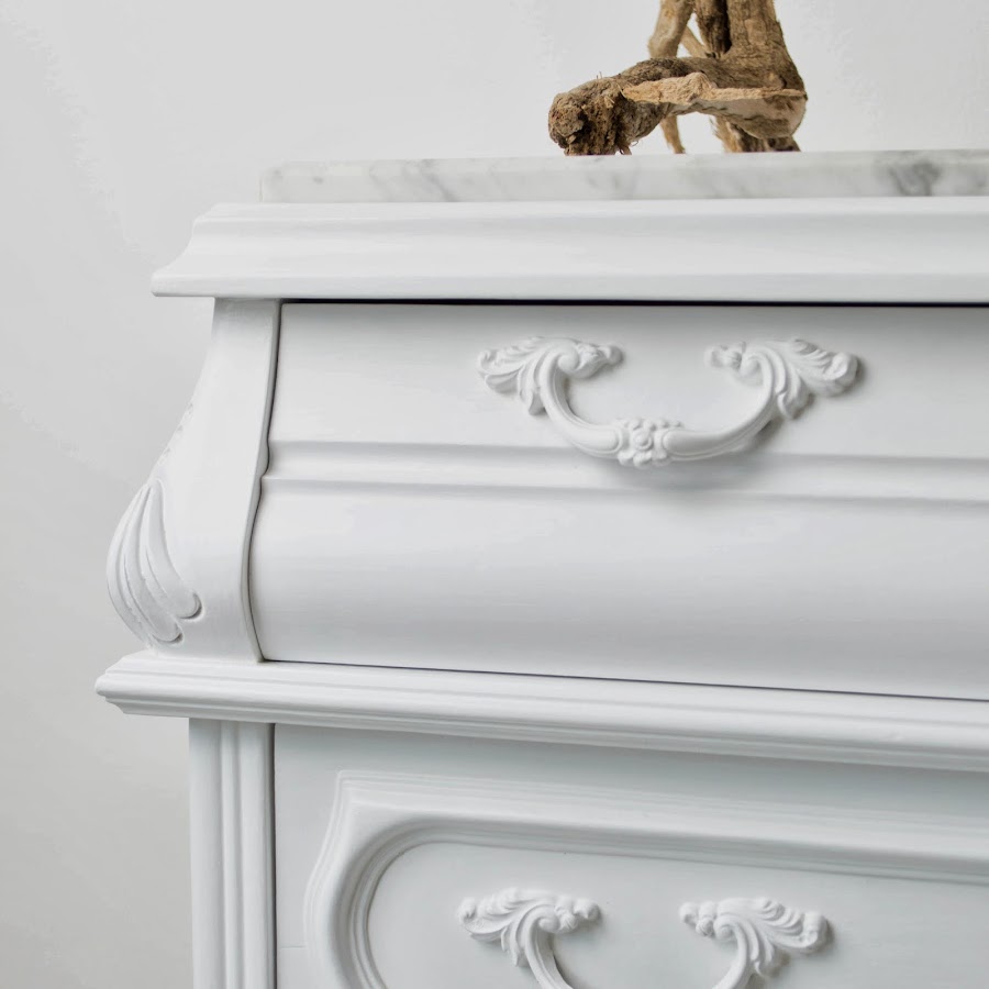 La cómoda Valverde apareció en nuestras vidas como tantas otras cosas: por casualidad. Alguien que se mudaba de piso la tenía y no le cabía en su nueva vivienda... Y las redes sociales hicieron su magia. Cuando la vimos, su peso y contundencia no dejaban lugar a duda: era un buen mueble, con mucho potencial, pero que nosotros no pondríamos en nuestra casa así, tal cual. El transporte hasta casa fue complicado, debido a su peso y al respeto que le teníamos al sobre de mármol... Y una vez en el taller, analizamos la situación: se trataba de una cómoda de los años 60-70, realizada en varias maderas diferentes, donde el mármol y sus patas decoradas marcaban el acabado que funcionaría mejor. Para resaltar las vetas del mármol, lo mejor era usar el blanco como color de fondo, y para resaltar sus patas decoradas y darle un toque de elegancia al conjunto, el dorado jugaría un buen papel.