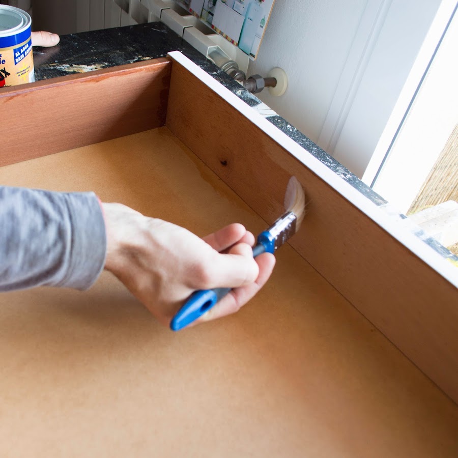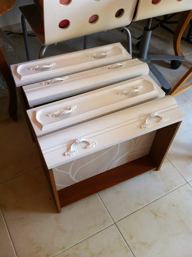 Barnizamos el interior de los cajones con barniz al agua resistente. Y decoramos el fondo con papel decorado para paredes, con un dibujo que podía recordar a las vetas del mármol.