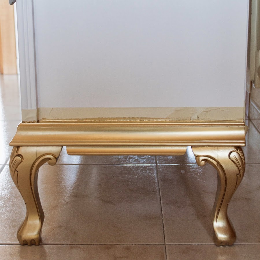 Lo rascamos superficialmente, ya que el barniz estaba en perfectas condiciones, y procedimos a encintar para no manchar el interior del mueble ni las patas. La pintura que utilizamos fue una Bruguer blanco satinado al agua. Tuvimos que darle un total de 3 capas para cubrir bien, con rascados suaves entre capa y capa. Una vez seco, descintamos y preparamos las zonas de las patas para poder empezar con el dorado...