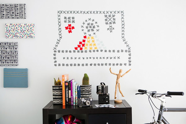 Las más atrevidas, podéis hacer cualquier otra figura con el patrón de punto de cruz, como en la fotografía en la que podemos ver un pajarillo. Para hacerlo, podéis ayudaros de una cuadrícula dibujada en la pared con lápiz del tamaño total que queráis. A continuación, deberéis ir rellenando la cuadrícula con X de cinta decorativa de los colores que os gusten más.