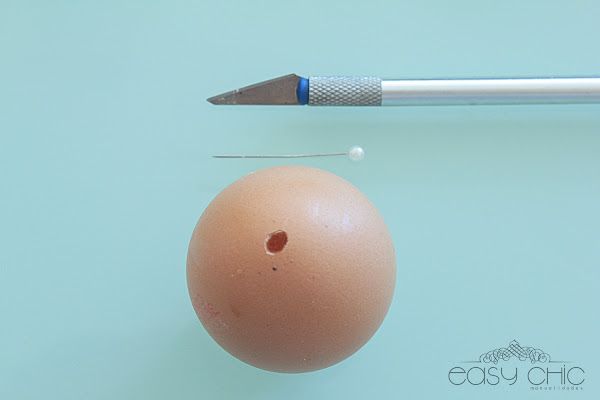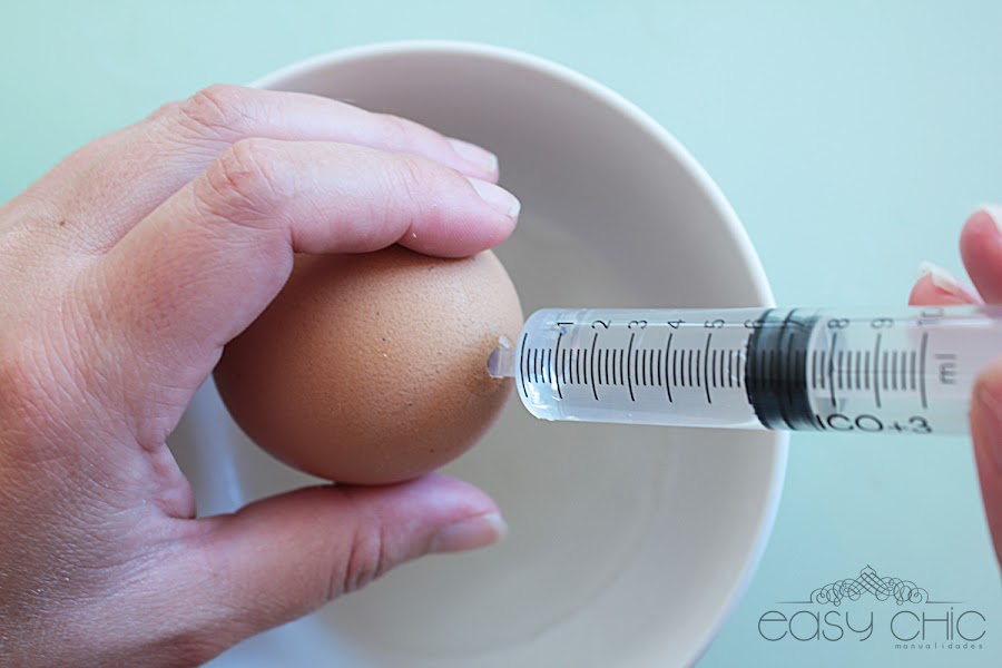 1. Lo primero de todo es vaciar el huevo de la yema y la clara. Para ello tendremos que hacer dos orificios en cada uno de sus extremos, un orificio más pequeño y otro un poco más grande, este último lo suficientemente grande como para meter la boquilla de la jeringuilla.