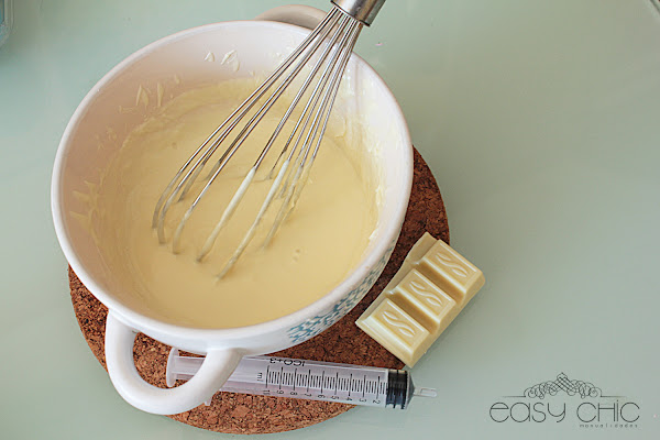 5. Derretiremos el chocolate al microondas o al baño maría. Yo he usado chocolate blanco, podemos usar chocolate negro o con leche, eso ya es decisión vuestra. Hoy vamos a hacer un poco de cocinillas para esta manualidad :D.
