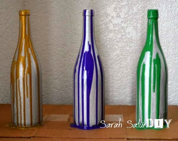 Pinta cada una de las botellas con el spray en aerosol. A continuación, aplica la pintura acriílica que hayas elegido mezclándolo antes con agua. De esta manera, chorreará por la botella, que es precisamente lo que queremos conseguir (recuerda proteger bien la zona en la que vas a realizar la manualidad, para que no manche). Haremos lo mismo con todas la botellas que vayamos a colocar.