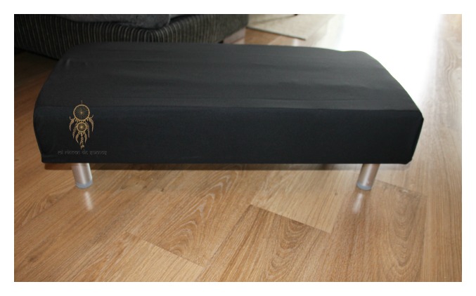 Una vez listo,ponemos las patas atornilladas, y cortamos en sobrante de tela interior.