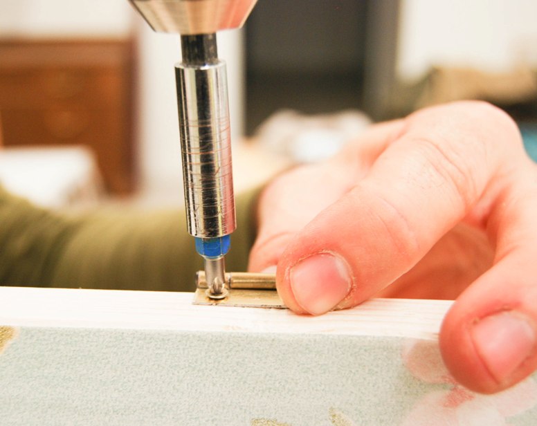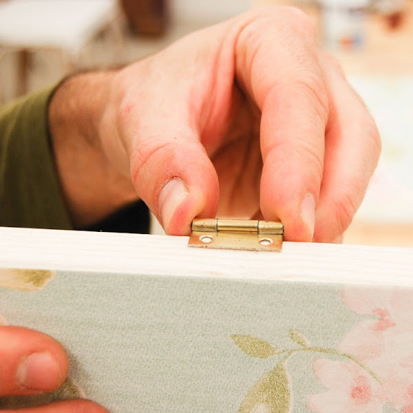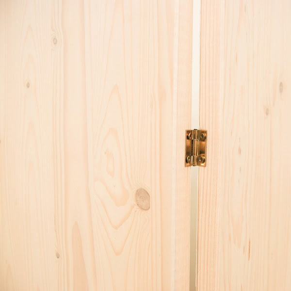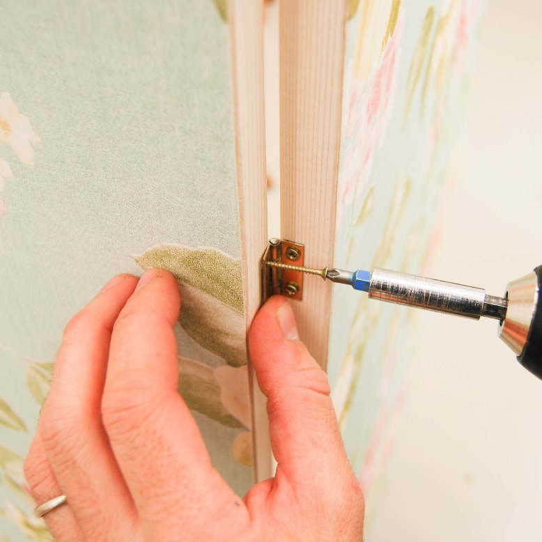 En nuestro caso, se trata de un biombo en zig-zag, así que el secreto está en colocar las bisagras de un lado en una lámina y del otro. Lo primero es decidir qué lámina será la central y cuales van a ser las laterales. En nuestro caso lo hicimos en función del dibujo, y una vez tenemos una lámina a la derecha y otra a la izquierda, colocamos las bisagras en cada una de las laterales: una en el centro y las otras 2 a 20cm del margen. Una vez colocados, colocamos de pie las dos primeras piezas, en ángulo, y acabamos de colocar los tornillos en la lámina central.