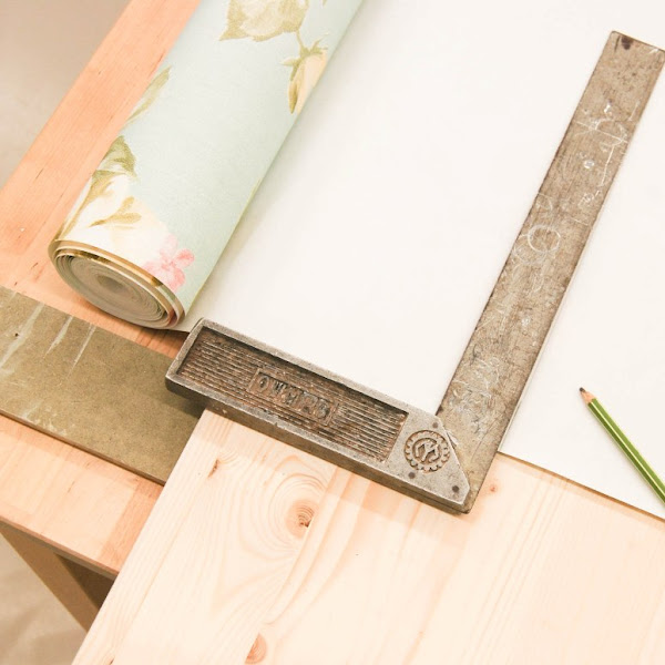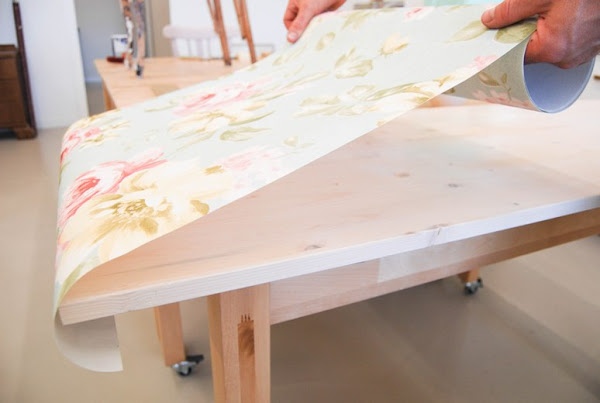 Una vez seco el barniz, cogemos las medidas de la lámina de madera y dejamos un margen de papel alrededor, que después cortaremos con cúter. En nuestro caso, el papel mide 52cm de ancho, así que sobra 1cm por cada lado de nuestra lámina de madera. Después aplicamos cola blanca sobre toda la superficie, con ayuda de un pincel, que humedecemos de vez en cuando para ayudarnos a deslizar el pincel y conseguir una capa muy fina. Con el papel enrollado, lo vamos desenrollando a medida que lo aplicamos sobre la superficie y frotamos con un trapo para eliminar posibles burbujas de aire (no hay fotos porque ya no sabíamos con qué mano sujetar la cámara, jajaja).