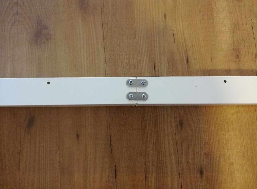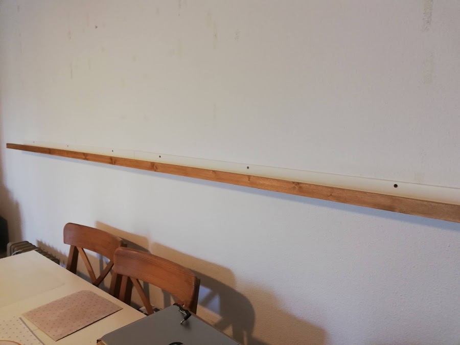 Para colgarlo a la pared, cada estante llevaba 3 agujeros, 6 en total entre los dos estantes pero odio agujerear la pared con tantos agujeros, así que una vez unidos los dos estantes sólo hice dos agujeros en el segundo y quinto agujero.