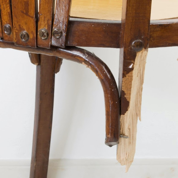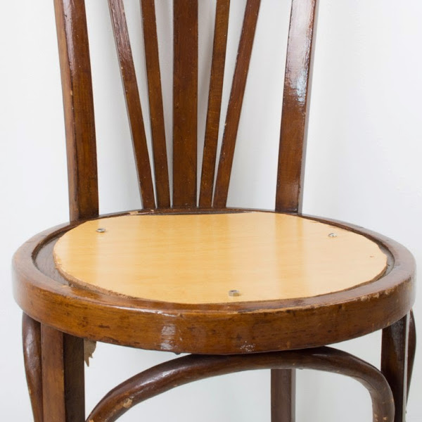 Esta silla perteneció a Mateo, quien recuerda que la compró en la década de los 60 porque su mujer se antojó con tener unas sillas Mocholi. Ya había roto el culo de la silla hace años subiendo de pie, pero fue cuando se le rompió la pata trasera cuando decidió poner fin a sus servicios. Evaluamos los daños: