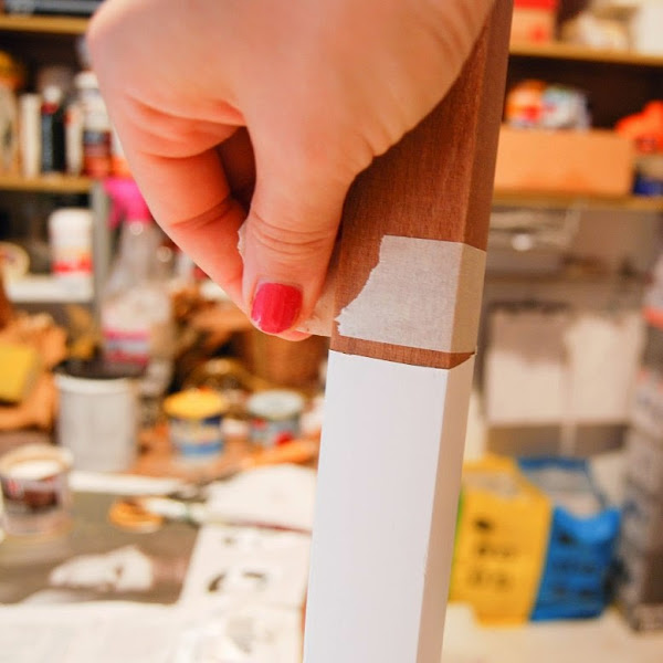Paso 7. Marcamos con un lápiz la altura a la que queríamos que empezara el color madera, lo tapamos con cinta de carrocero, para no mancharlo al pintar la silla de blanco. También protegimos la marca de la silla con un trozo de adhesivo, para conservarla. Le dimos una primera capa de imprimación blanca al agua. Y con dos capas de pintura blanca satinada al agua hubo suficiente para cubrir el color de la madera.