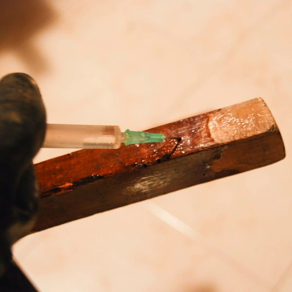 Paso 1. Tratamiento anticarcoma: lo más cómodo para quien no está acostumbrado es usar un matacarcoma con aplicador incorporado, en nuestro caso usamos la jeringa para inyectar el producto a cada uno de los orificios, después pincelamos toda la superficie, tapamos con un plástico y lo dejamos actuar durante 4 días.