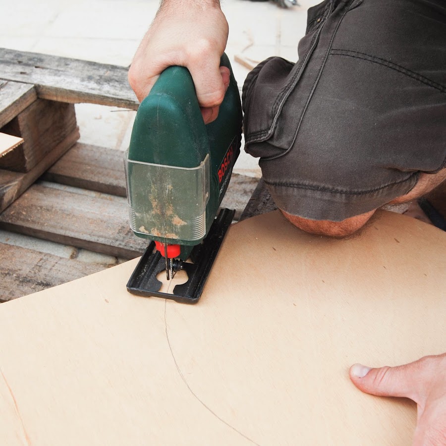 Paso 4. Con la ayuda de un cartón, dibujamos el contorno del culo, uno más grande para la parte de arriba y otro más pequeño para la parte interna. Lo traspasamos a una lámina de tablero de 5mm, que recortamos con una caladora, en el caso de la parte superior, es preferible cortarla más grande, proque luego se puede lijar hasta ajustar a la medida exacta. Encolamos, pegamos y nos ayudamos con sargentos para que quede bien sujeto.