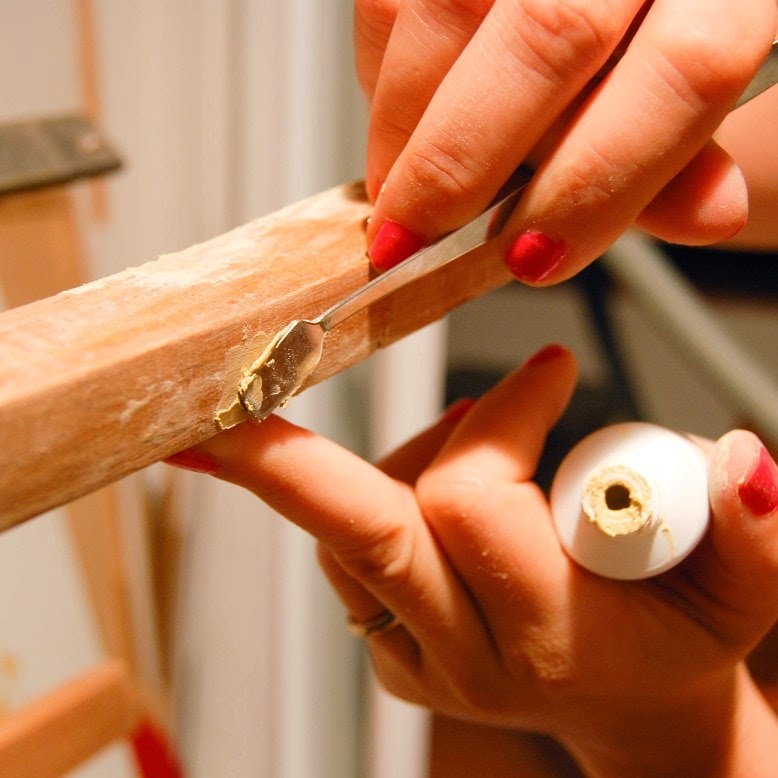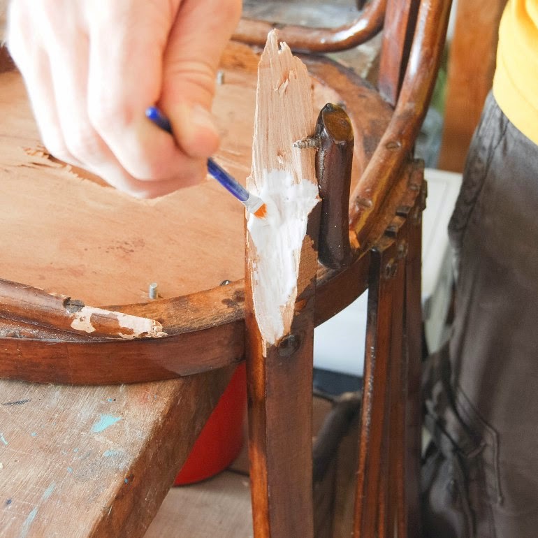 Paso 6. Reparamos los orificios de carcoma, arañazos y cicatrices de la rotura con masilla para madera. Usamos la blanca para toda la silla, excepto la de color pino que la usamos para las patas, ya que el acabado iba a ser en color madera. Una vez seca la masilla, lijamos toda la silla hasta dejarla fina al tacto. Ya podemos pasar al siguiente paso...