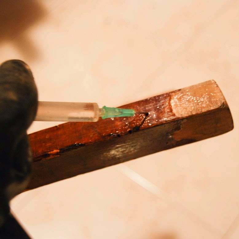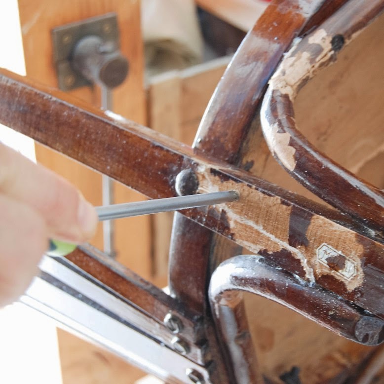 Paso 3. Además de la cola, añadimos unos tirafondos, para asegurarnos que la pata no se volvería a romper. Los hundimos, para después poderlos esconder con masilla y que no hubiera ni rastro de ellos.