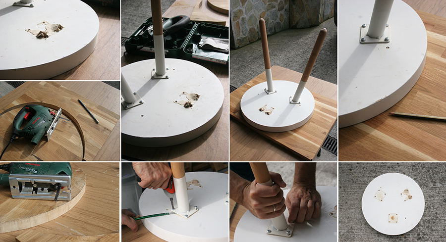Con el soporte sobrante, dibujamos sobre la madera el círculo de la mesa. Luego lo cortamos con la caladora.