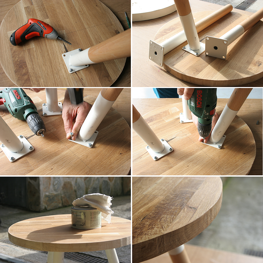 Medimos todo bien con la regla, marcamos los puntos de sujeción de las patas, y las unimos a su nueva madera con unos tornillos gruesos.