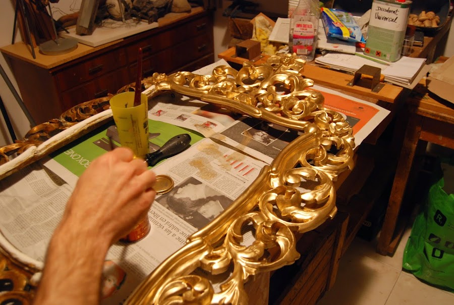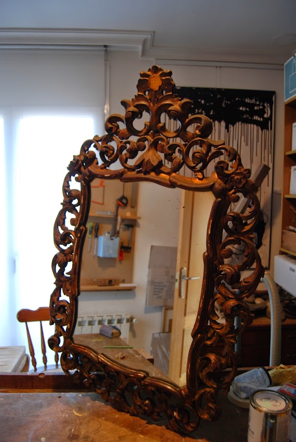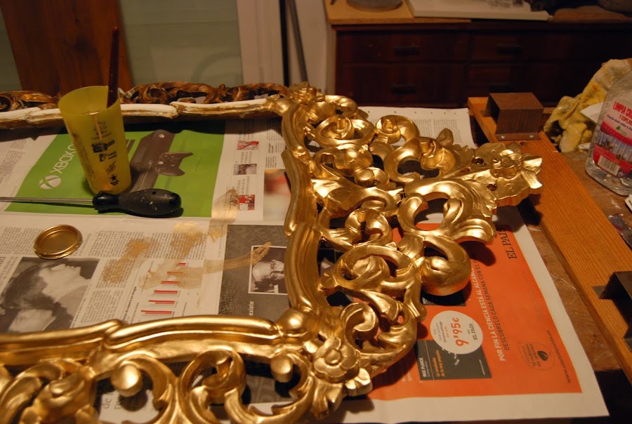 Como veis, no usamos pan de oro, que habría sido lo más adecuado para una pieza de esta época, pero la propietaria lo quiso pintado con pintura metálica dorada, así que no hizo falta pintar de color rojizo la base y procedimos a dorar el marco. El truco para que esta pintura quede bien es aplicarla con mucha delicadeza y sin estirar demasiado la pintura, con un pincel muy suave.