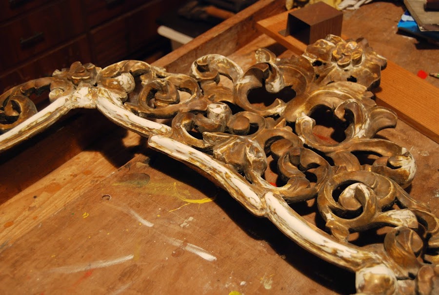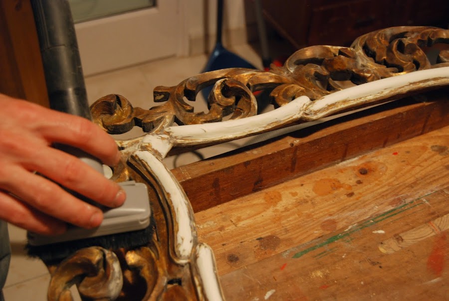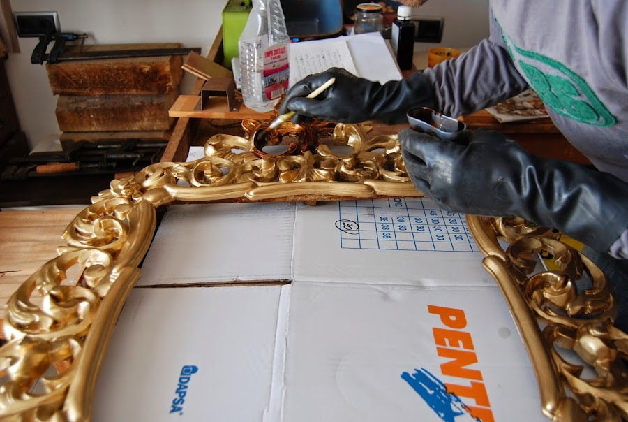 Una vez dorado, protegemos la pintura con goma laca, para que las partículas de latón de la pintura metálica no se oxiden y se ennegrezcan. Y procedemos a aplicar una pátina de betún de Judea. Nosotros la aplicamos con pincel, trabajamos en zonas pequeñas para que no se seque antes de retirarlo con un paño, suavemente, y los excesos los corregimos con un pincel limpio, que además nos ayuda a distribuir mejor la pátina y que no queden zonas demasiado ennegrecidas, lo que le daría un aspecto falso. Hay que pillarle el truquillo al principio, mejor probar con una madera antes y, cuando consigas la intensidad de envejecido que te guste, aplicarlo a la pieza definitiva...