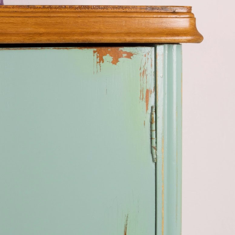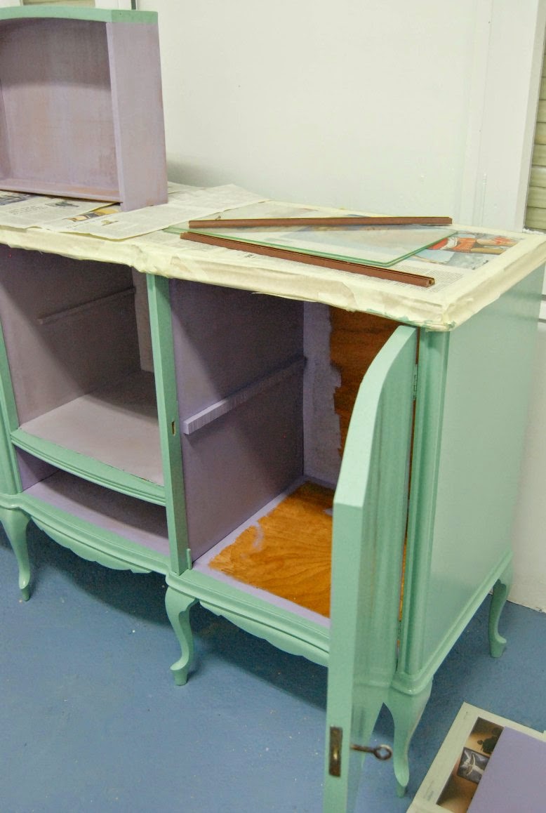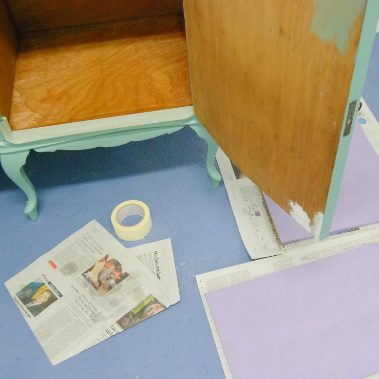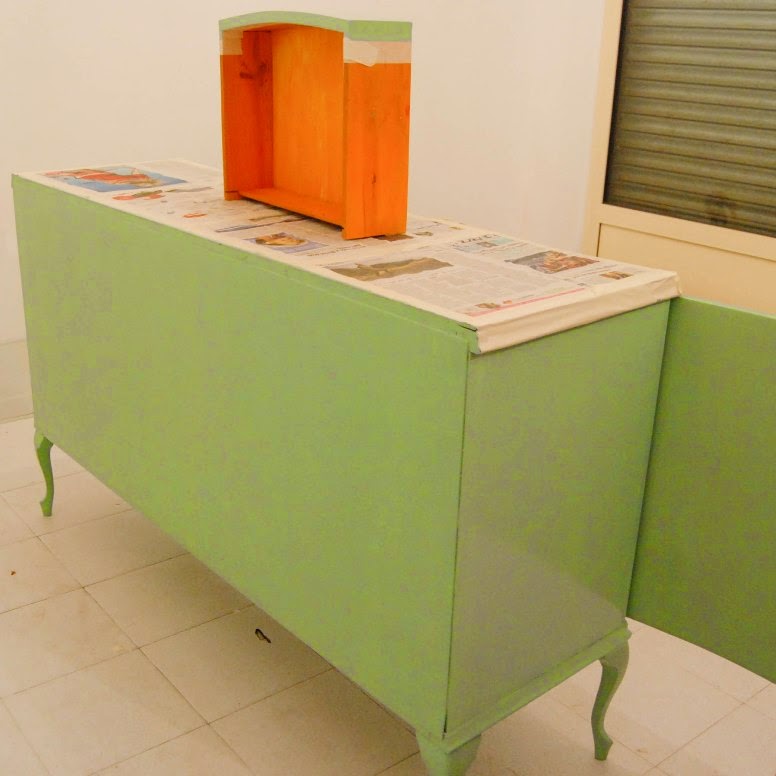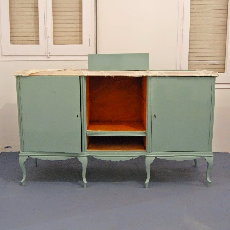 El sobre del mueble estaba en perfecto estado, pero la moldura de alrededor presentaba barniz en mal estado, así que lo decapamos. Una vez todo está seco, lo rascamos, aspiramos el polvo y limpiamos todo con un paño húmedo,cubrimos el sobre y pusimos la cinta de carrocero para delimitar las zonas que queríamos fueran de color verde antiguo, un esmalte ecológico al agua que mezclamos nosotros: