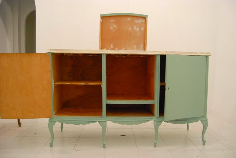 Y así empezó todo, lo vimos en la tienda de segunda mano y nos enamoramos perdidamente... A duras penas cabía en el coche... En la tienda nos comentaron que lo habían tratado ya contra la carcoma, pero como no podíamos arriesgarnos, una vez en el taller, empezamos a aplicar el producto anticarcoma, inyectando uno a uno cada agujero, para después pincelar todo el mueble y finalmente taparlo bien con plástico resistente y dejarlo así durante 4 días. Una vez retirado el plástico, es mejor dejar que se ventile un día más, para poder trabajar con el mueble sin intoxicarse... Siguiente paso: comprovar la estabilidad del mueble (tuvimos que encolar patas) y que las puertas y cajón cerrasen bien (también tuvimos que tocarlos un poco). Y tapar los agujeros y grietas con masilla: