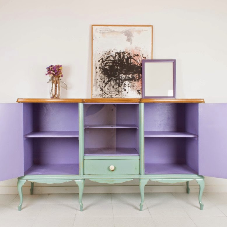 Nuestro aparador Laia es uno de esos muebles especiales que ya sabemos va a estar siempre ligado a nosotros, por lo que ha significado hacerlo y por la historia que descubrimos detrás de él... En primer lugar, es el primer mueble que hemos creado para el espacio-taller que compartiremos con otros artistas, que te explicamos ayer aquí. Y su historia la conocimos gracias a un montón de cartas y felicitaciones que había dentro del cajón, olvidadas allí como un legado de la familia... Maria y Eugeni vivían en un pequeño pueblo del Empordà. Entre felicitaciones de Navidad e invitaciones de bodas, un dibujo muy especial, el de su nieta Laia felicitando a su abuela por su cumpleaños... Los colores que ella usó, así como esa inocencia y dulzura que desprendían sus trazos, nos inspiraron para pintar esta pieza en verde antiguo y violeta.
