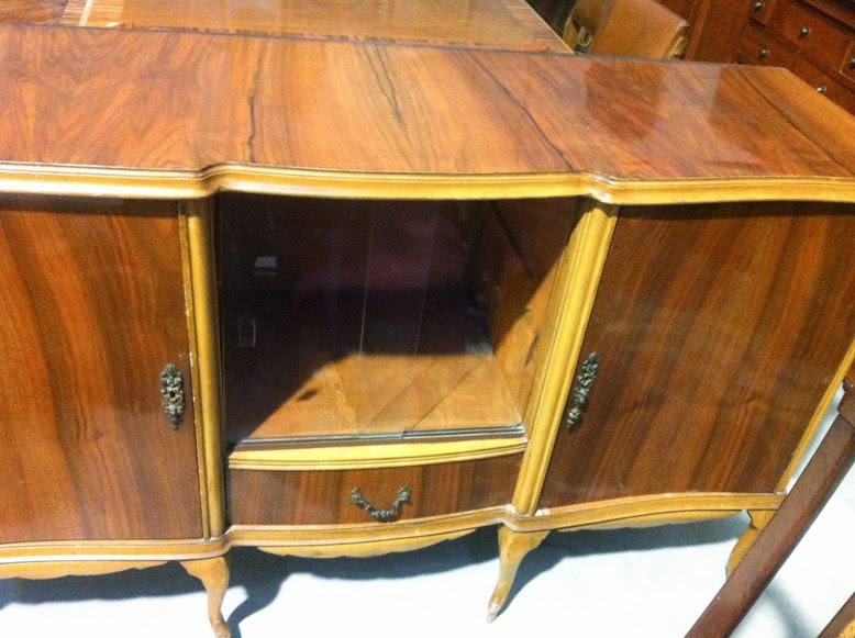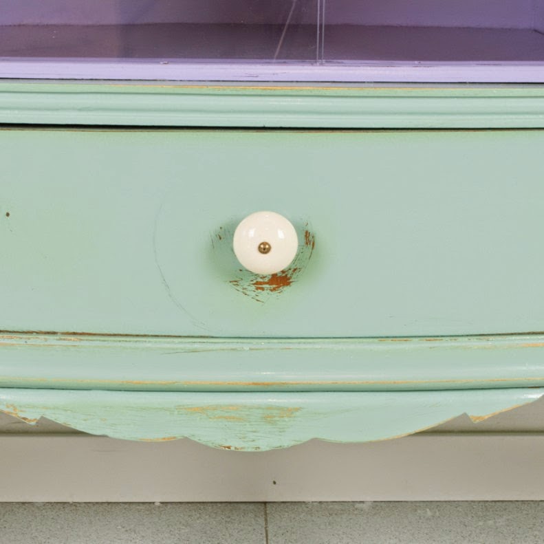 Le dimos una segunda capa de violeta, también al agua, y una vez seco, retiramos la protección del sobre, teñimos la moldura que previamente habíamos decapado, para igualar el tono con la chapa de nogal del sobre. Después, procedimos a rascar el mueble para conseguir un efecto decapé, y así nos recordase lo que ha vivido. Para acabar, lo barnizamos con barniz al agua satinado para una mayor protección, tanto la parte exterior del mueble, donde habíamos rascado, como la parte del sobre que habíamos decapado... Y este es el resultado: