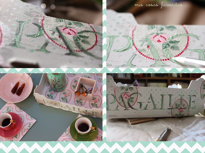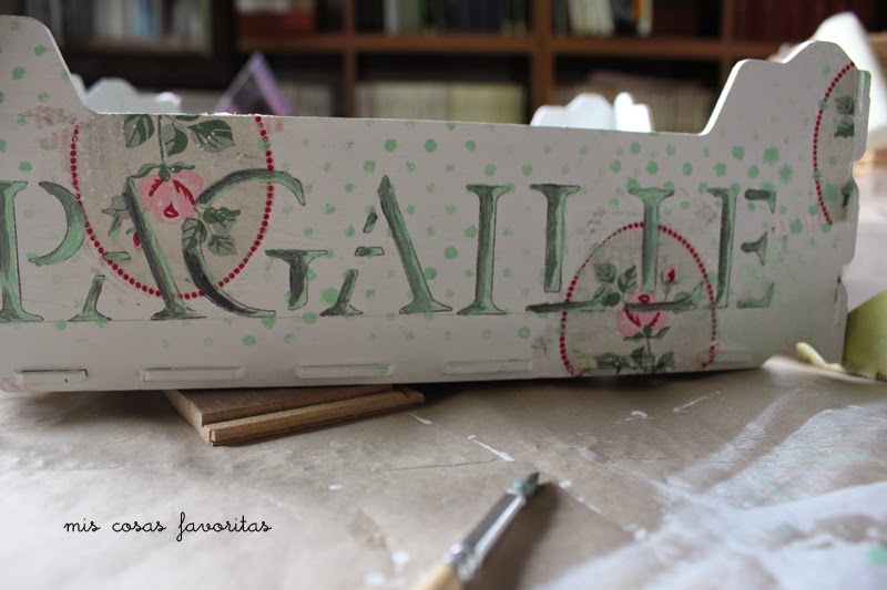 A continuación, estarcimos los lunares con una plantilla rebonita de Lucía del blog Momentos vintage y completamos pintando encima el texto para enfatizar las zonas que nos interese. Una vez seca la pintura conviene dar otra lijadita.