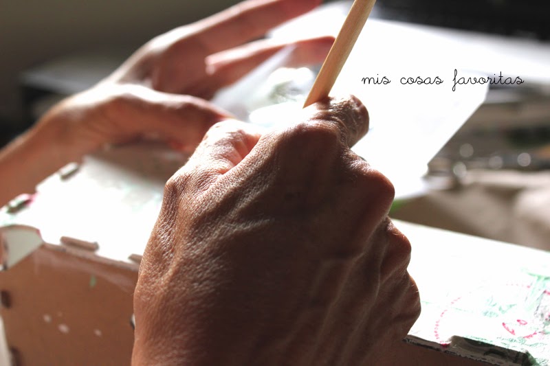 3. Con medium o con cola blanca diluida en agua (a ojímetro)y un pincel, aplicar el motivo. Presionar con los dedos y dejar secar.