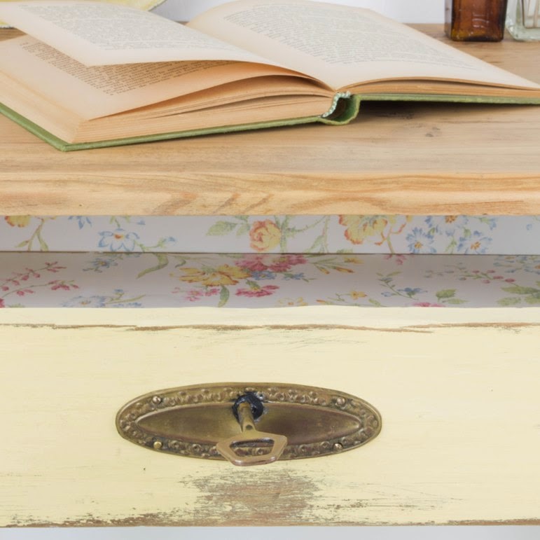 3. Rascamos las zonas de mayor roce, para conseguir un acabado desgastado y envejecido, como si desde el principio Herminia la hubiese tenido así en su cocina. La limpiamos bien con un trapo húmedo y le aplicamos una capa de barniz mate al agua como protección. El interior del cajón lo forramos con papel de pared pintado y la llave la fijamos a la cerradura (que no tenía el mecanismo original) para que funcionara como tirador, con pegamento y después rellenamos con silicona negra.