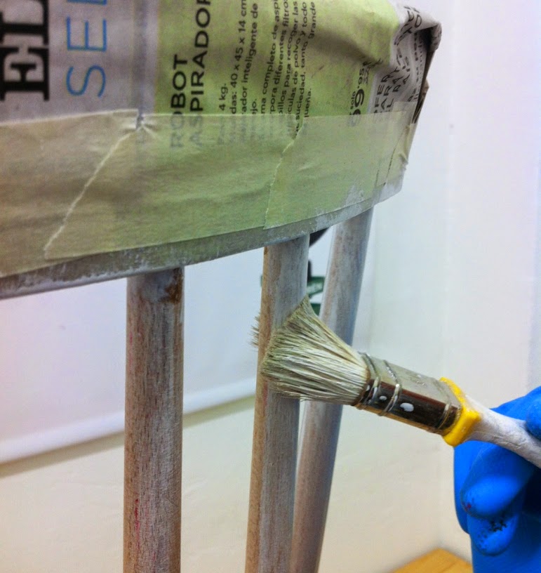 Dejamos secar la última capa de barniz 24horas y procedimos a tapar perfectamente las zonas que no iban pintadas de blanco, aplicando la cinta con mucho cuidado para que no quedara ninguna zona levantada por donde pudiera pasar la pintura... Y le dimos una capa de imprimación.