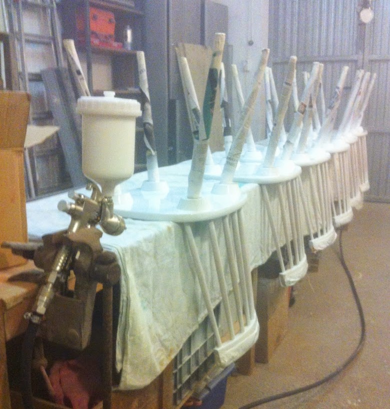 Cuando la imprimación estaba seca al tacto, llevamos las sillas a un taller sucio, donde creamos una atmósfera libre de corrientes y polvo, para poder aplicar la pintura con pistola. Fuimos aplicando capas muy finas, sin centrarnos en ningún punto para no crear zonas de piel de naranja o con goteos. Para conseguir el acabado que nos gustaba le dimos 4 capas aproximadamente.